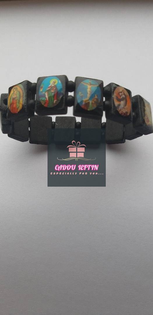 Bratara din lemn de culoare neagra, cu 12 icoane bisericesti, partea exterioara este lacuita (lucioasa).
