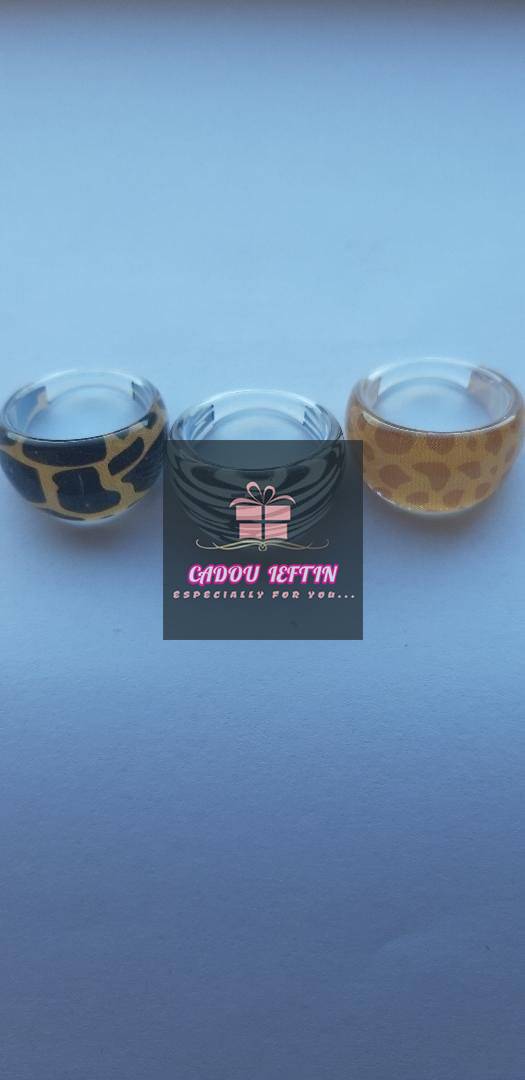 Set 3 inele cu nuante alb-negru-galben din plastic, dimensiune inferioara 0,3 cm, dimensiune superioara 1,4 cm, diametru interior 1,8 cm.
