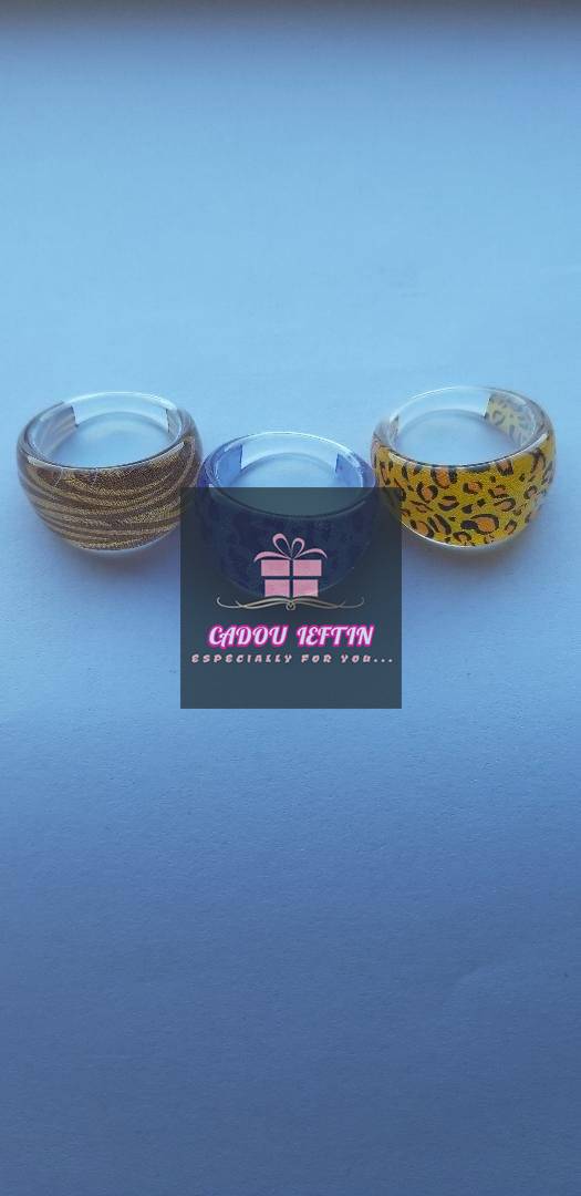 Set 3 inele cu nuante albastru-galben-maro din plastic, dimensiune inferioara 0,3 cm, dimensiune superioara 1,4 cm, diametru interior 1,8 cm.