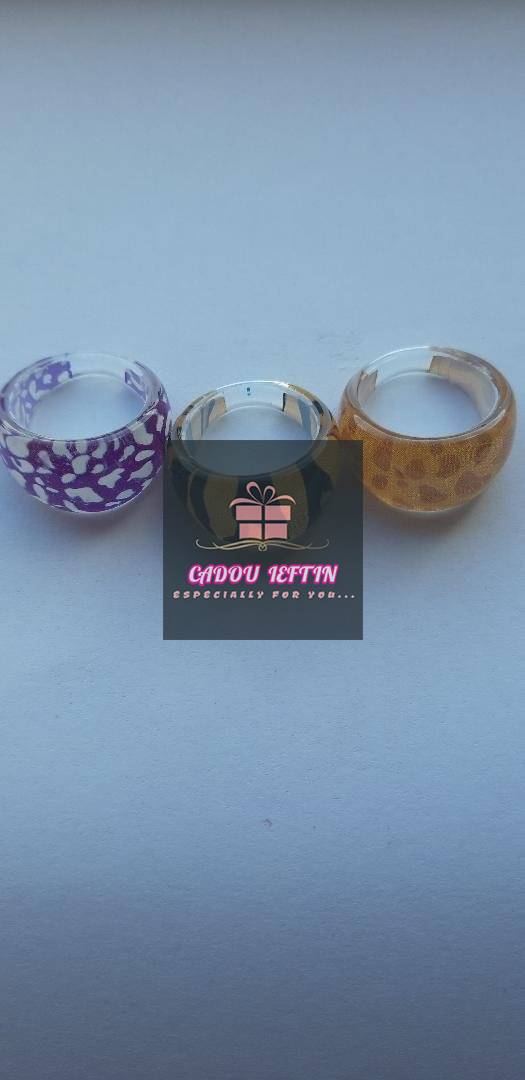 Set 3 inele cu nuante mov-galben-negru din plastic, dimensiune inferioara 0,3 cm, dimensiune superioara 1,4 cm, diametru interior 1,6 cm.